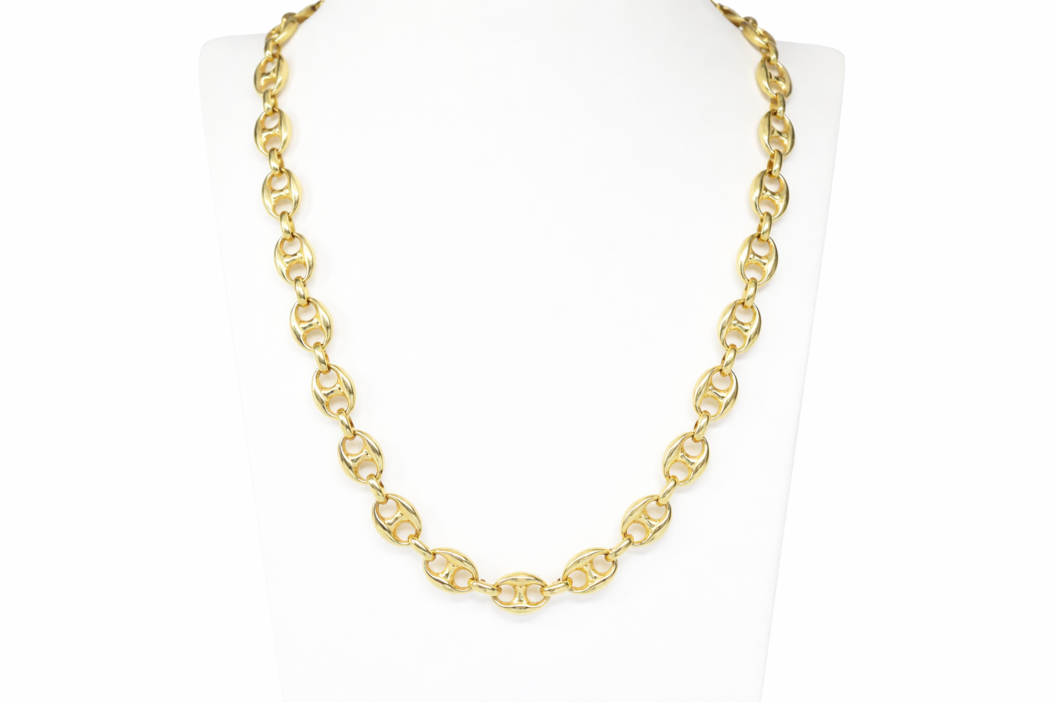 La Mariner Chain 6mm x 20 pulgadas, fabricada en oro sólido de 18 kilates, presenta un diseño de eslabones ovalados con barra central, característico del estilo náutico. Esta estructura aporta mayor rigidez y estabilidad en comparación con cadenas de eslabón abierto.